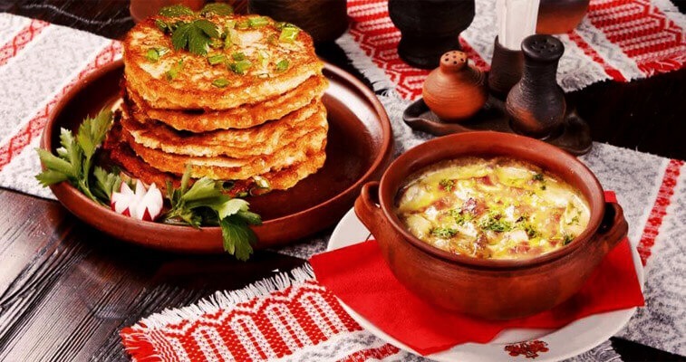 Основные блюда белорусской национальной кухни: тонкие лепешки «перепеча», «драники» или «деруны» из муки и картофеля, особые блины из нескольких видов муки, гороховые оладьи, клецки с разнообразной начинкой, «солодуха» (своеобразное блюдо из неоднократно нагреваемой и охлаждаемой опары).