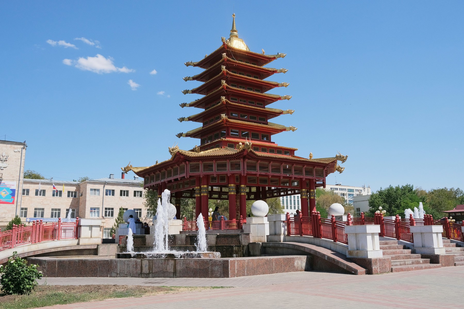 13:30 Посещение хурула «Сякюсн-Сюме» школа Гелуг линии ламы Цзонхавы. Хурул расположен в 6 километрах от столицы Калмыкии, недалеко от поселка Аршан. Официальное же название этого культового сооружения — «Геден Шеддуп Чойкорлинг», что по-тибетски буквально означает «Святая обитель теории и практики школы Гелуг», а в вольном переводе – «Святая обитель просвещенных монахов». Это название даровал Его Святейшество Далай-лама XIV заранее, еще до