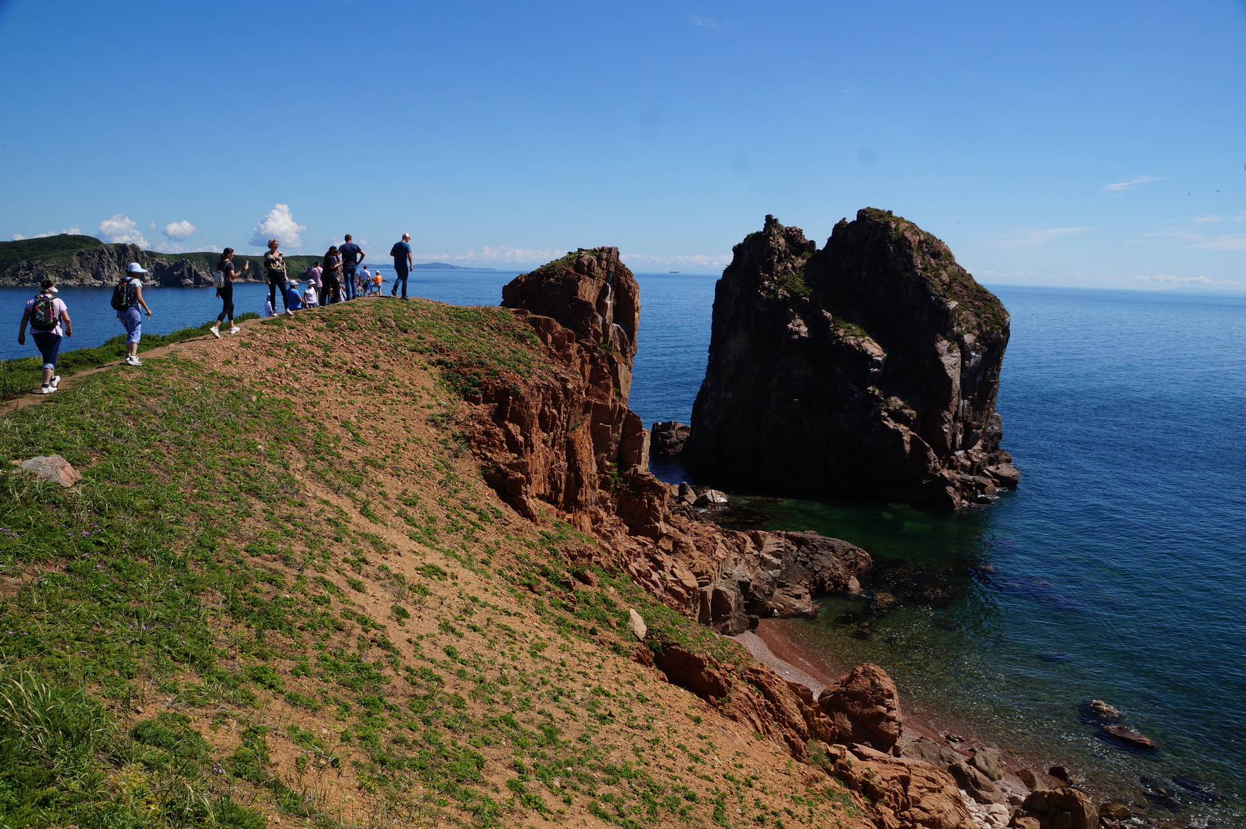 Выход в море на быстроходном катере. Морская прогулка, в пути около 1,5 часов. Высадка на необитаемые острова архипелага Императрицы Евгении. Пешеходная прогулка по островам Желтухина и Пахтусова занимает 40-60 минут на каждом. Продолжительный отдых и купание запланирован на острове Рикорда. На необитаемых островах нет пирса, высаживаемся на необорудованный берег, спуск по крутому трапу-лестнице. Обед-пикник.